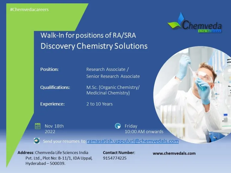 Candidates who cannot attend the interview on the Walk-In dates can forward their resume to ramasatish.uppuluri@chemvedals.com.