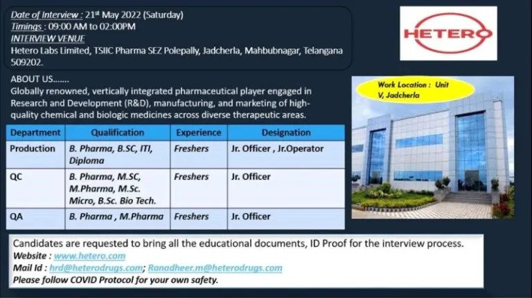 Venue: Hetero Labs Limited, TSSIIC, Pharma SEZ Polepally, Jadcherla, Mahabubnagar, Telangana – 509202