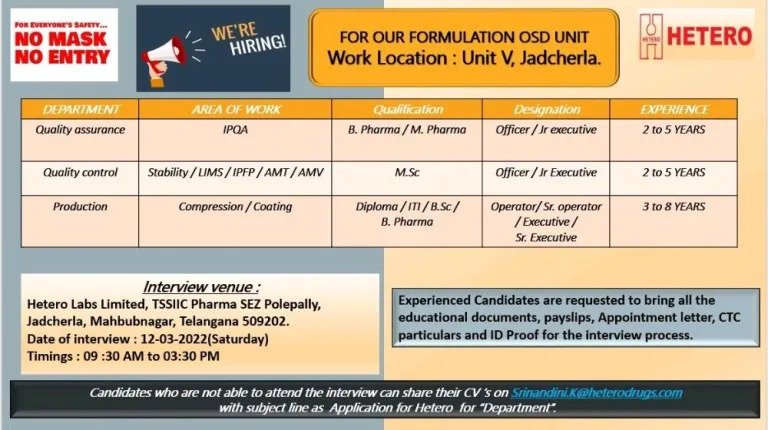 Candidates who are not able to attend the interview can share their CV’s on Srinandini.K@heterodrugs.com