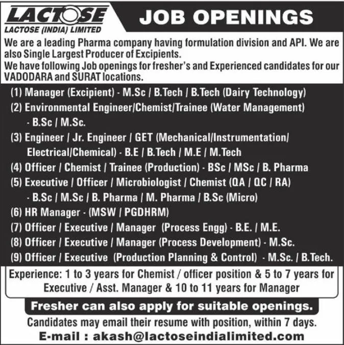 Interested candidate can send their CV on akash@lactoseindialimited.com