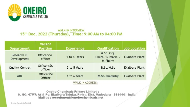 Venue: Oneiro Chemicals Pvt. Ltd, Survey No: 475/P, Ekalbara, Baroda, Gujarat, India