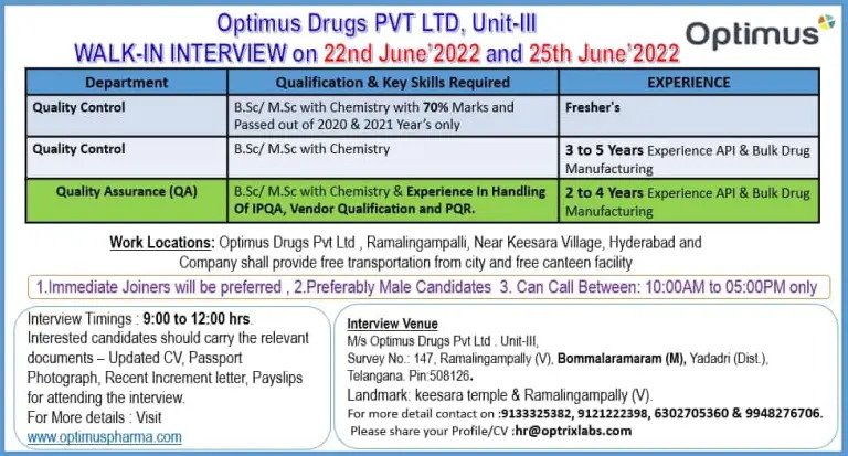 Venue: Optimus Drugs Pvt. Ltd,Bommalaramaram, yadadri, T.S