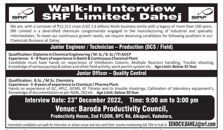 Interested candidates can walk for interview Title to mail id. SENDCV.DAHEJ@srf.com