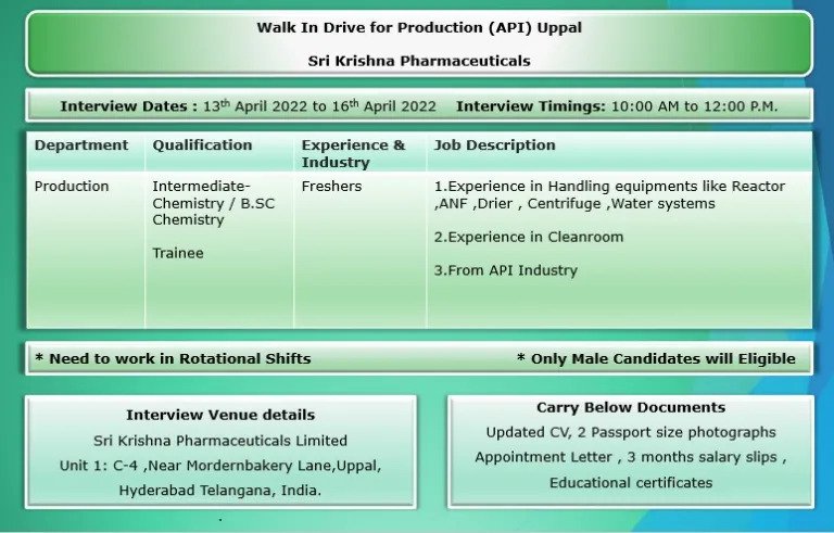 - Qualification: B.Sc / M.Sc / B.Pharm / M.Pharm / Intermediate