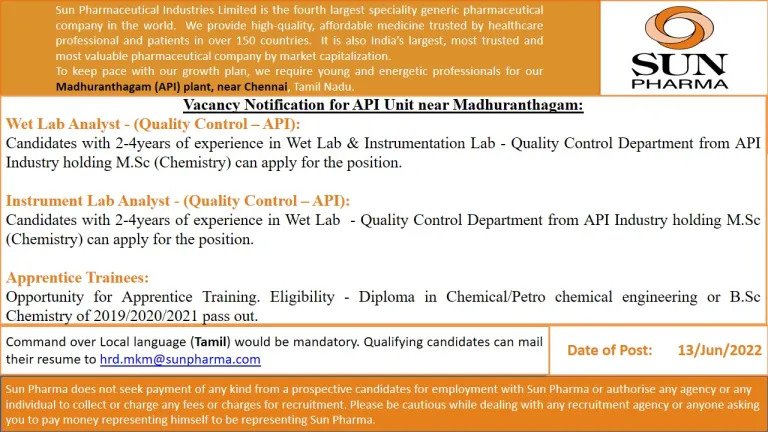 Command over Local language (Tamil) would be mandatory, Qualifying candidates can mail their resume to hrd.mkm@sunpharma.com