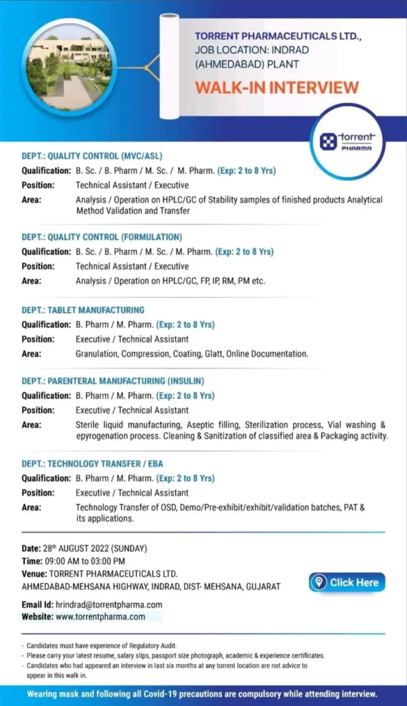 Venue: TORRENT PHARMA, INDRAD (AHMEDABAD) PLANT, AHMEDABAD-MEHSANA HIGHWAY, INDRAD, DIST- MEHSANA, GUJARAT