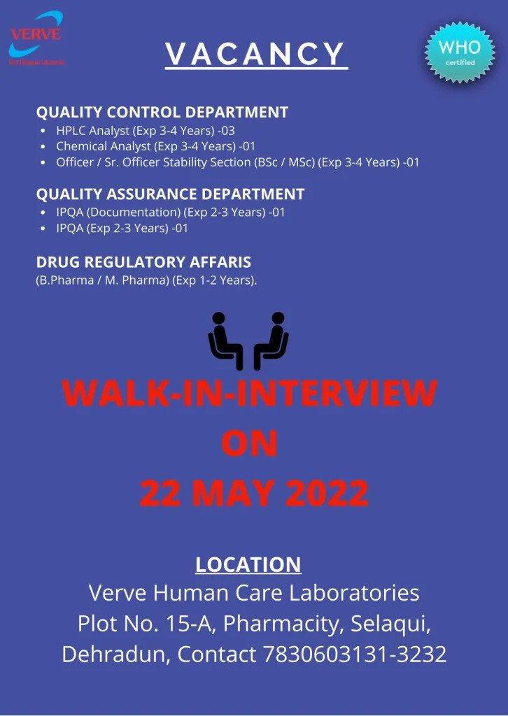 Venue: Verve Human Care Laboratories, Plot No: 15-A, Pharmacity, Selaqui, Dehradun, Uttarakhand (India).