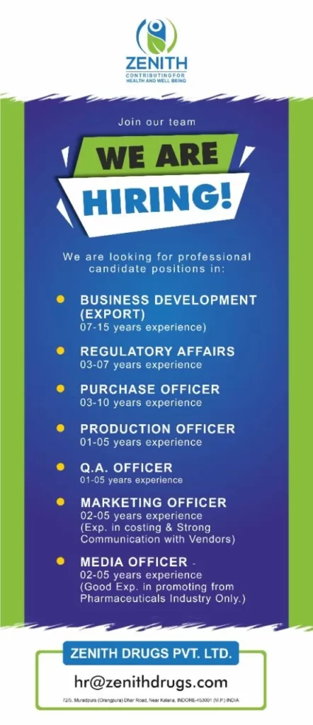 Send your Resume to hr@zenithdrugs.com